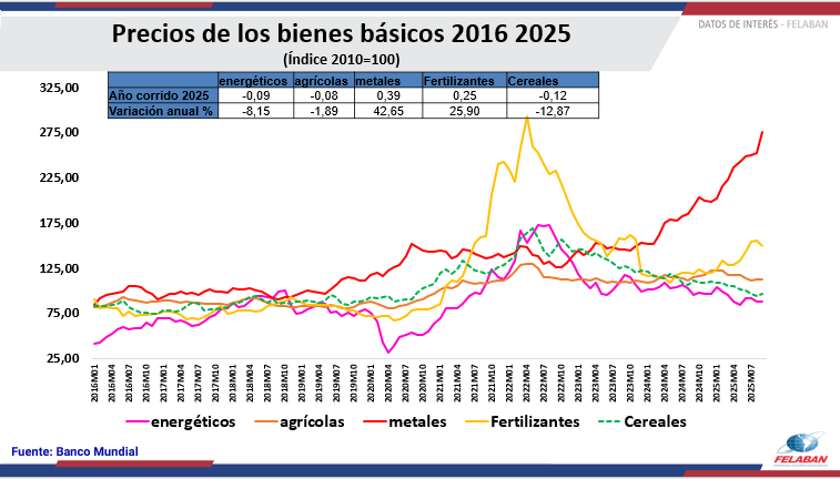 De acuerdo con el Banco Mundial en 9 meses del año 2025 el índice de precios de los bienes básicos cae un -6%. Por ejemplo,