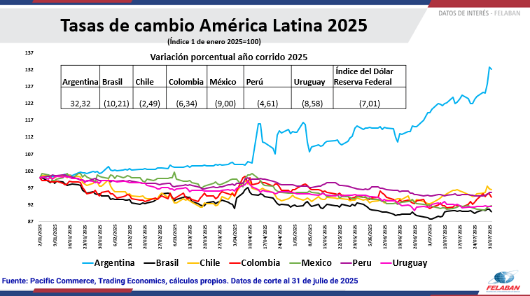 En América Latina buena parte de las tasas de cambio han seguido con fuerza la tendencia de debilidad que durante el año 2025 ha mostrado el dólar de los Estados Unidos. Brasil por ejemplo, una actividad económica robusta, una política monetaria contraccionista y un buen flujo de comercio internacional han conllevado un fortalecimiento de dicha moneda; esto contrarrestando una situación de debilidad que se vio en el año 2024. En Chile, el repunte de los precios del cobre y la baja de la inflación son factores que impulsan el fortalecimiento del peso. En Argentina, la situación es bien diferente debido a una menor facturación exportadora, un fallo adverso contra el país en los tribunales de Estados Unidos por una disputa con YPF, un menor uso de estrategias de carry trade por parte de operadores financieros locales, unas mayores importaciones de bienes y servicios. Todo esto en medio de un esquema de flotación supeditado a bandas cambiarias